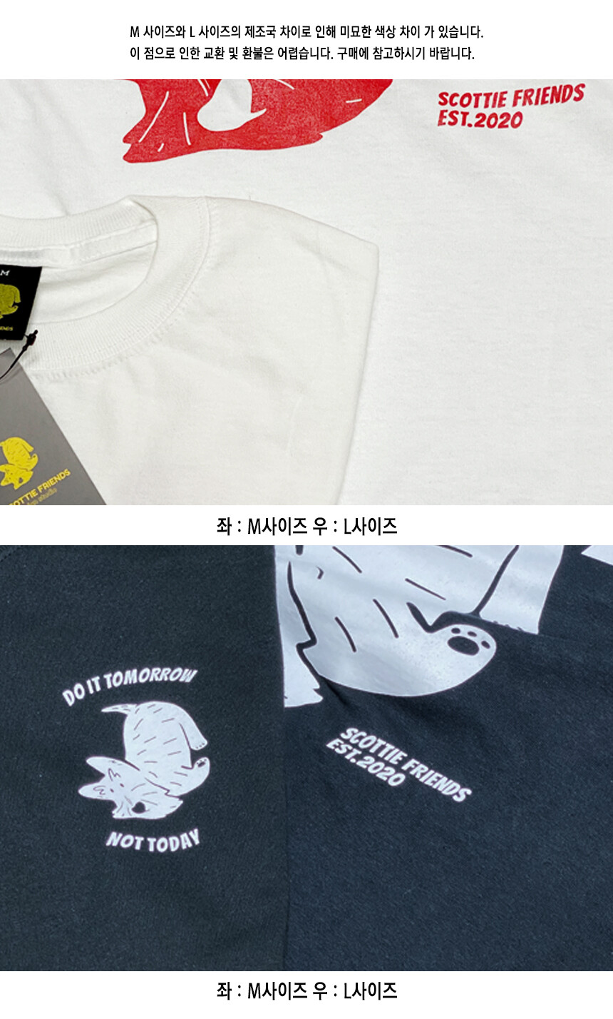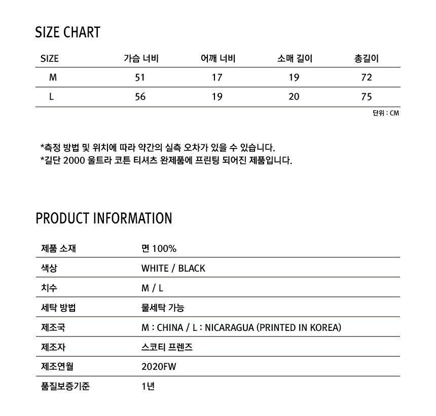 컬러는 WHITE, BLACK으로 준비했으며, 사이즈는 M, L 두 종류로만 준비되어 있습니다.