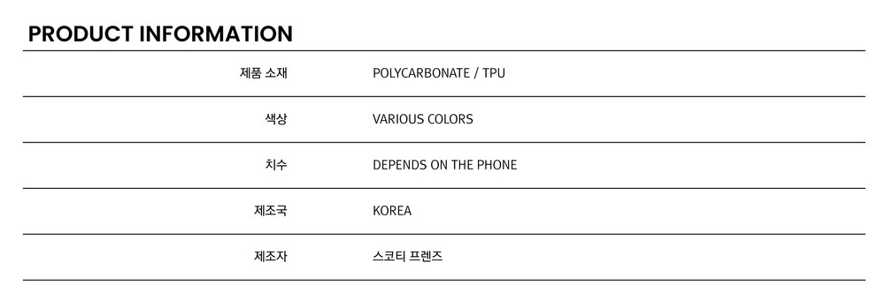 재질 하드타입 : 폴리카보네이트 / 젤리타입 : TPU / 투명젤하드 : TPU, 폴리카보네이트