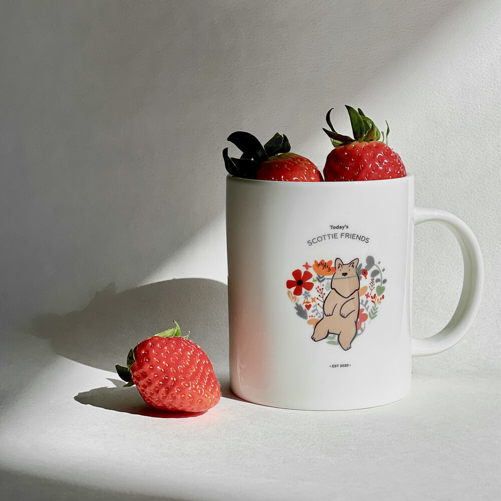 은은한 아이보리 톤의 머그컵에 스코티 프렌즈의 2021 SS 메인 일러스트들을 인쇄하였습니다.