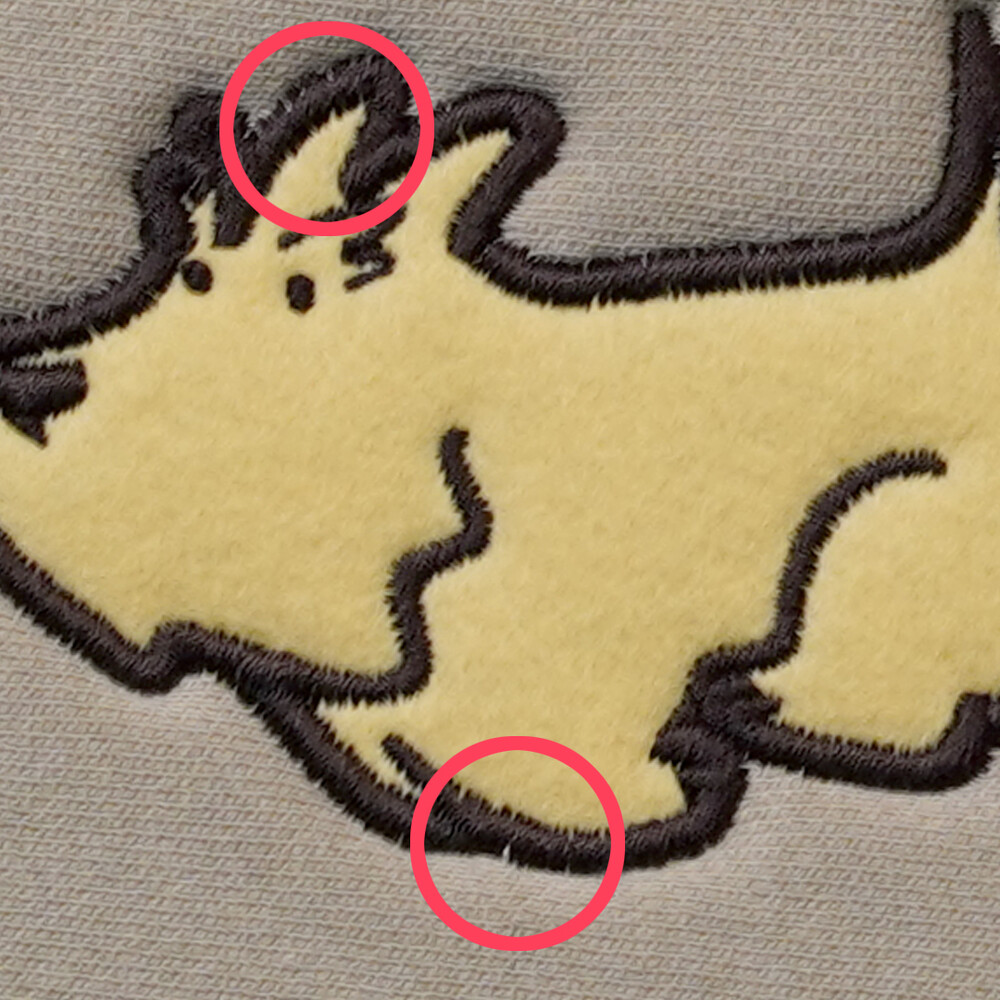 02. 자수 사이로 원단이 보일 수 있습니다. 이는 뒷 원단 컬러가 밝고 자수 색상이 어두워 상대적으로 도드라져보이는 것으로,